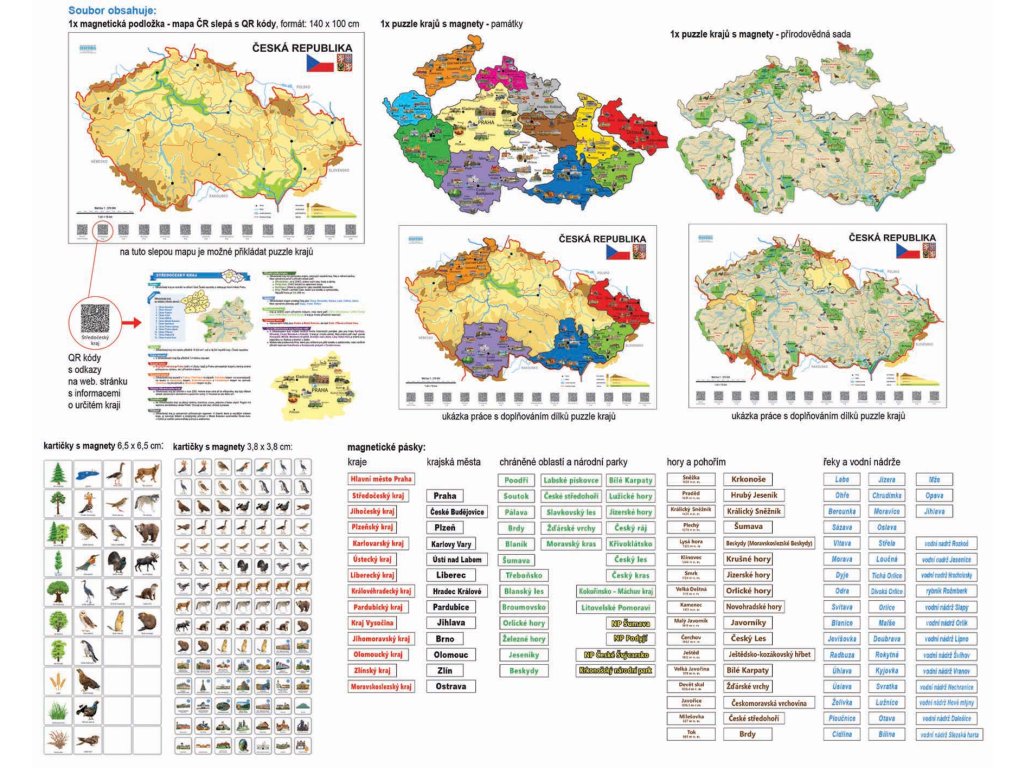 Slepá mapa je doplněna dvěma sadami puzzlů krajů –