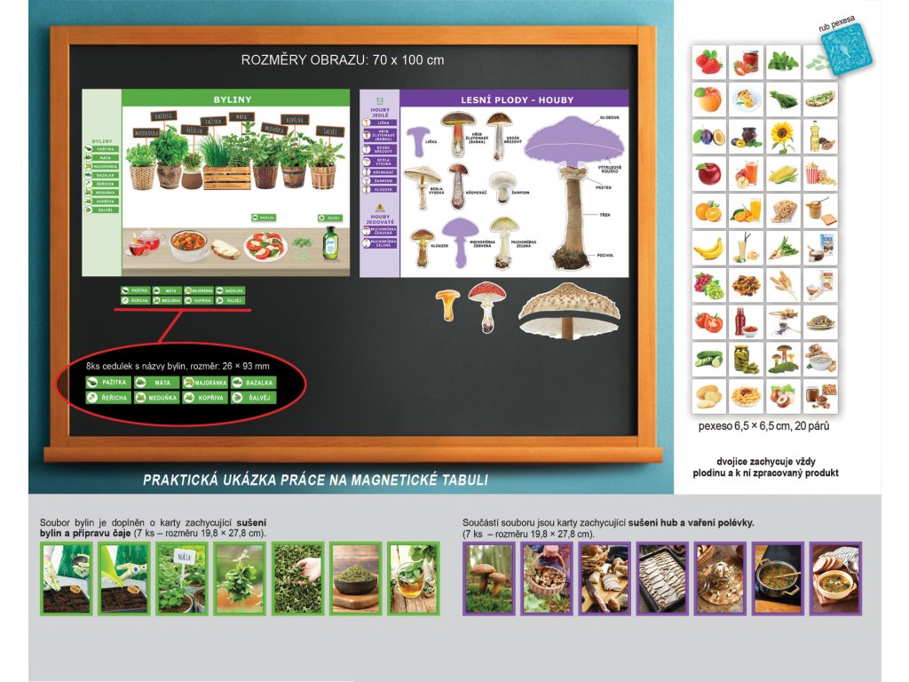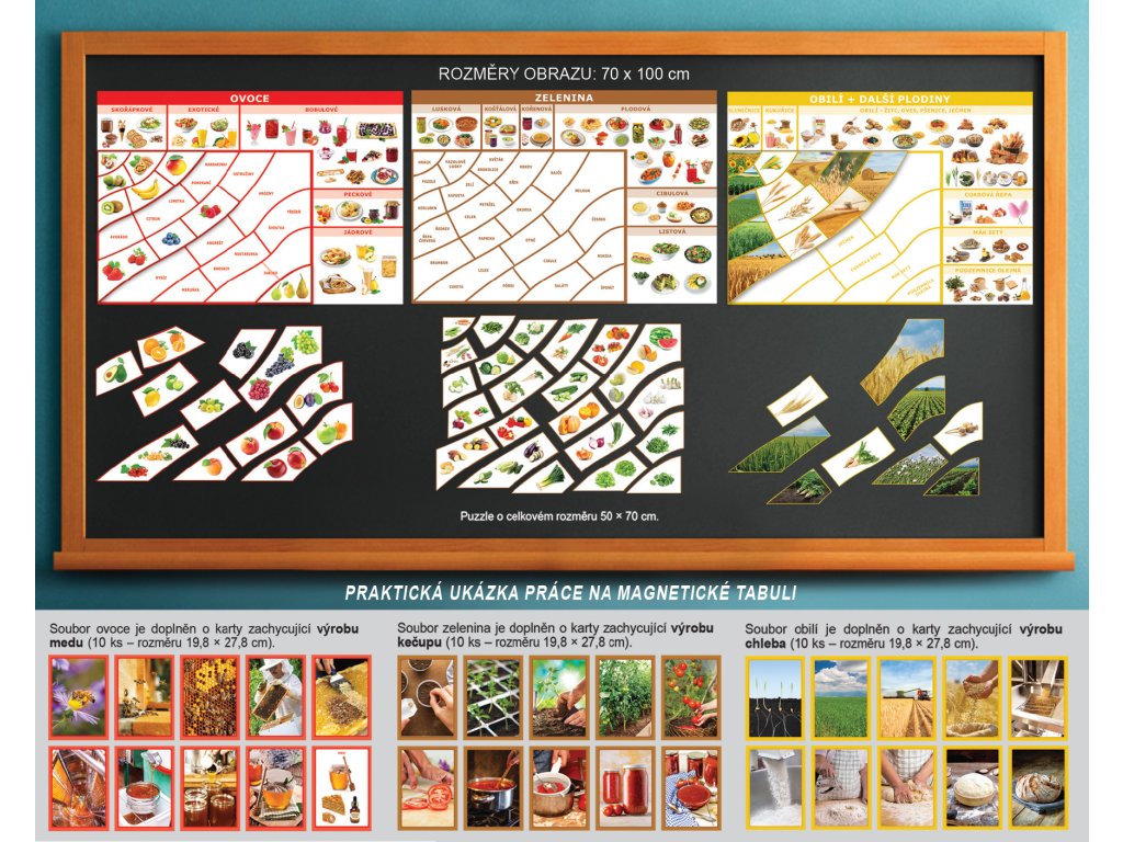 ostatní plodiny, lesní plody – houby. Slouží jako magnetické puzzle, která podporují získávání